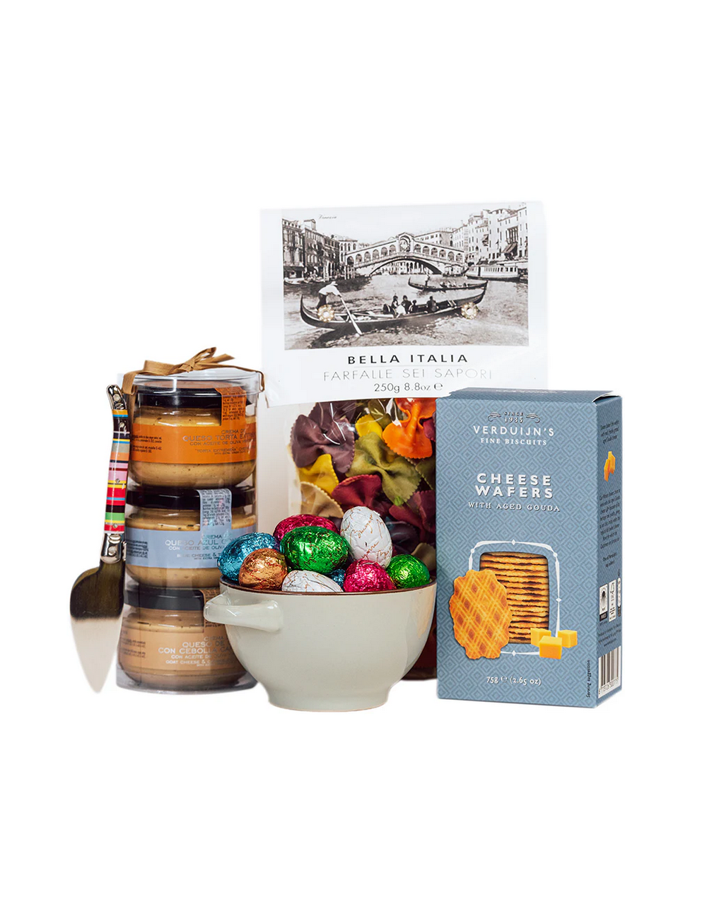 Acest pachet include cate ceva potrivit pentru iubitorii de snacks: farfalle colorate - e primavara, totusi!, un set de trei creme delicioase de branza din Spania, crackers cu branza, un cutitas pentru tartinabile si un bol dragut umplut cu oua de ciocolata belgiana pentru desert. Gourmet indeed!