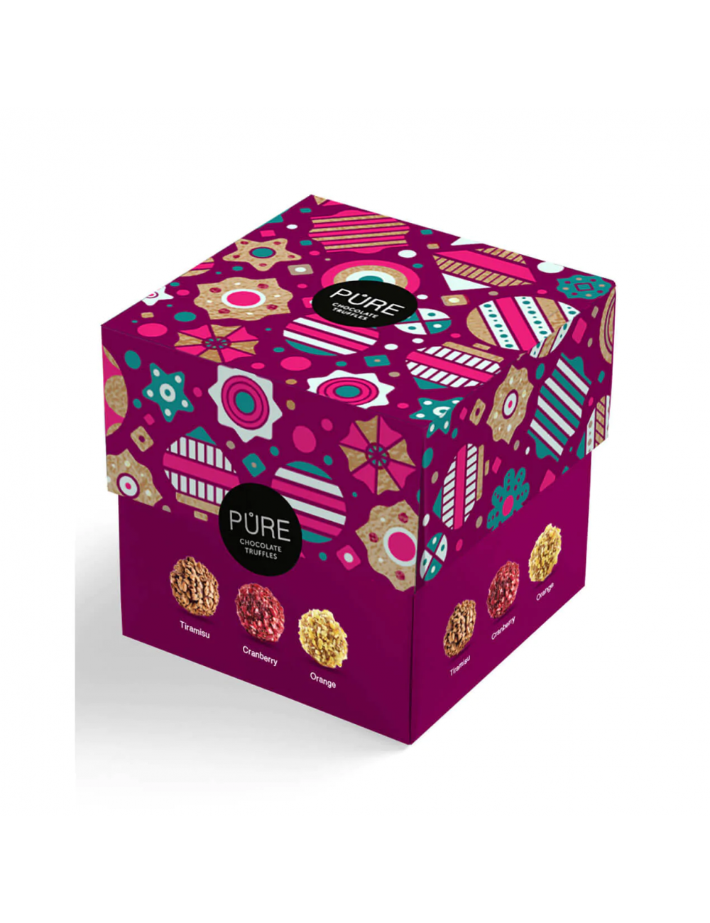 Un cub umplut cu trei tipuri de trufe de ciocolata belgiana delicioasa: cu turta dulce, merisoare si portocale.