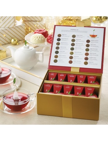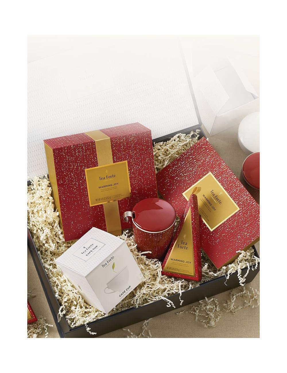 Un cadou cu un design care atrage toate privirile si imbie la atingere. Face parte din noua colectie limitata Warming Joy 2021. Fa senzatie cu aceasta colectie expansiva de ceaiuri Tea Forte. Contine un mix impresionant de ceaiuri din intreaga lume, ambalate in haine festive, care invita la o experienta de explorare memorabila. Pachetul cadou include: TEA CHEST WARMING JOY 2021, cutie cu 40 de piramide CUTIE CU 15 INFUZII DE CEAI WARMING JOY 2021 PETITE TEA TREE WARMING JOY 2021, CUTIE CU 4 PIRAMIDE CANA KATI WARMING JOY 2021, din ceramica, cu pereti dubli, cu capac si infuzor din inox. Capacitate 350 ml CAFE CUP, ceasca eleganta din portelan, capacul cestii mentine ceaiul cald si lasa sa se vada frunza din varful piramidei din matase. Dupa infuzarea ceaiului, capacul devine farfurioara. Capacitate: 230 ml Produs pentru Germania. Ambalat in China. Creat in SUA.