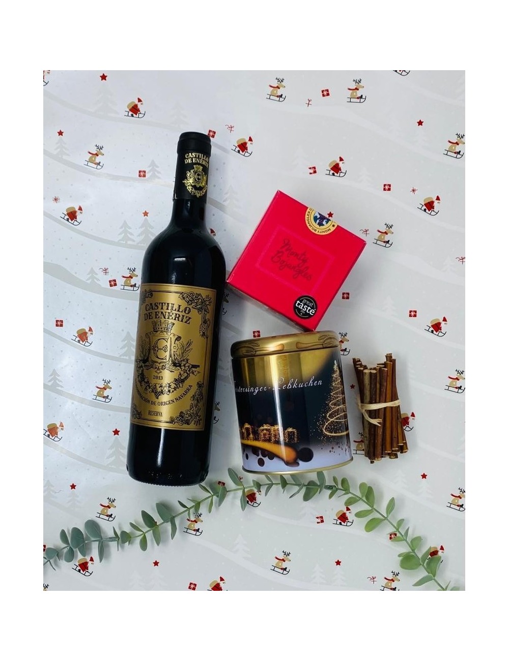 CHRISTMAS TREE GIFT este un cadou fin si rafinat, care iti invaluie toate simturile! Pachetul cadou include: CASTILLO DE ENERIZ RESERVA 750 ml Castillo de Eneriz Reserva, DO Navarra, este un cupaj de cabernet sauvignon, merlot si tempranillo.Vinul este baricat 24 de luni in butoaie de stajar american si stejar frantuzesc. Vinul are o culoare rosie de intensitate medie. Olfactiv, se simt fructe rosii coapte, cu note de caramel. Arome de chocolata din baricurile de stejar. Gustativ, vinul este elegant, cu tanini matasosi. TRUFE DIN CIOCOLATA MONTY BOJANGLES 100 G Trufe frantuzesti cu mai multa ciocolata, desavarsite cu un strat generos de cacao rafinata dulce-amaruie. Aromele calde de unt i-au sugerat lui Monty o parada vioaie de obiective fantastice. CHRISTMAS TREE CUTIE METALICA TURTA DULCE WICKLEIN 112G CUTIE METALICA CU TURTA DULCE WICKLEIN 112G: 2 sortimente (4 bucati) de turta dulce cu minim 20% nuci. CUTIE METALICA CU TURTA DULCE WICKLEIN 112G contine turta dulce autentica Wickelin, care are in compozitie multe nuci ce adauga un placut element crocant in textura pufoasa. Turta dulce este un produs sezonier disponibil doar in perioada octombrie-ianuarie. Produs in Germania, la Nurnberg – locul de origine al turtei dulci. CUTIE PENTRU CADOU