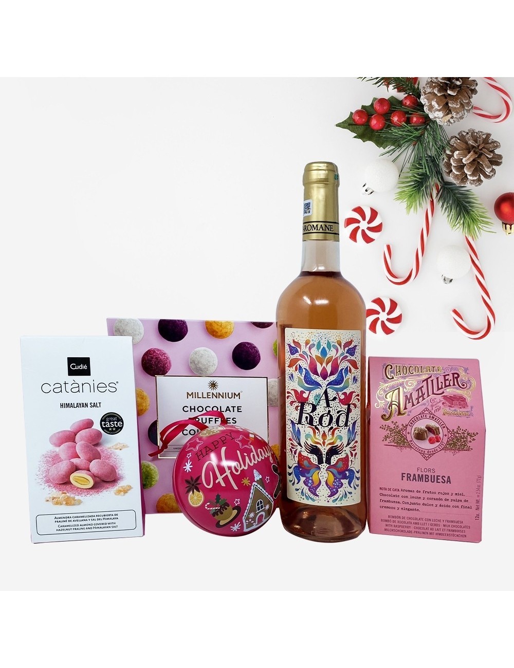 Pachetul cadou include: Vin A rod ROSE Cabernet Sauvignon 750 ml; Glob de Craciun cu praline belgiene Valentino la 100g; Migdale glazurate Catanies Hymalayan Salt Cudie 80g; Cutie cu trufe de ciocolata Unique Luxury truffles 195g; Cutie cu praline din ciocolata Amatller Raspberry Flowers 72g; Cutie cadou.
