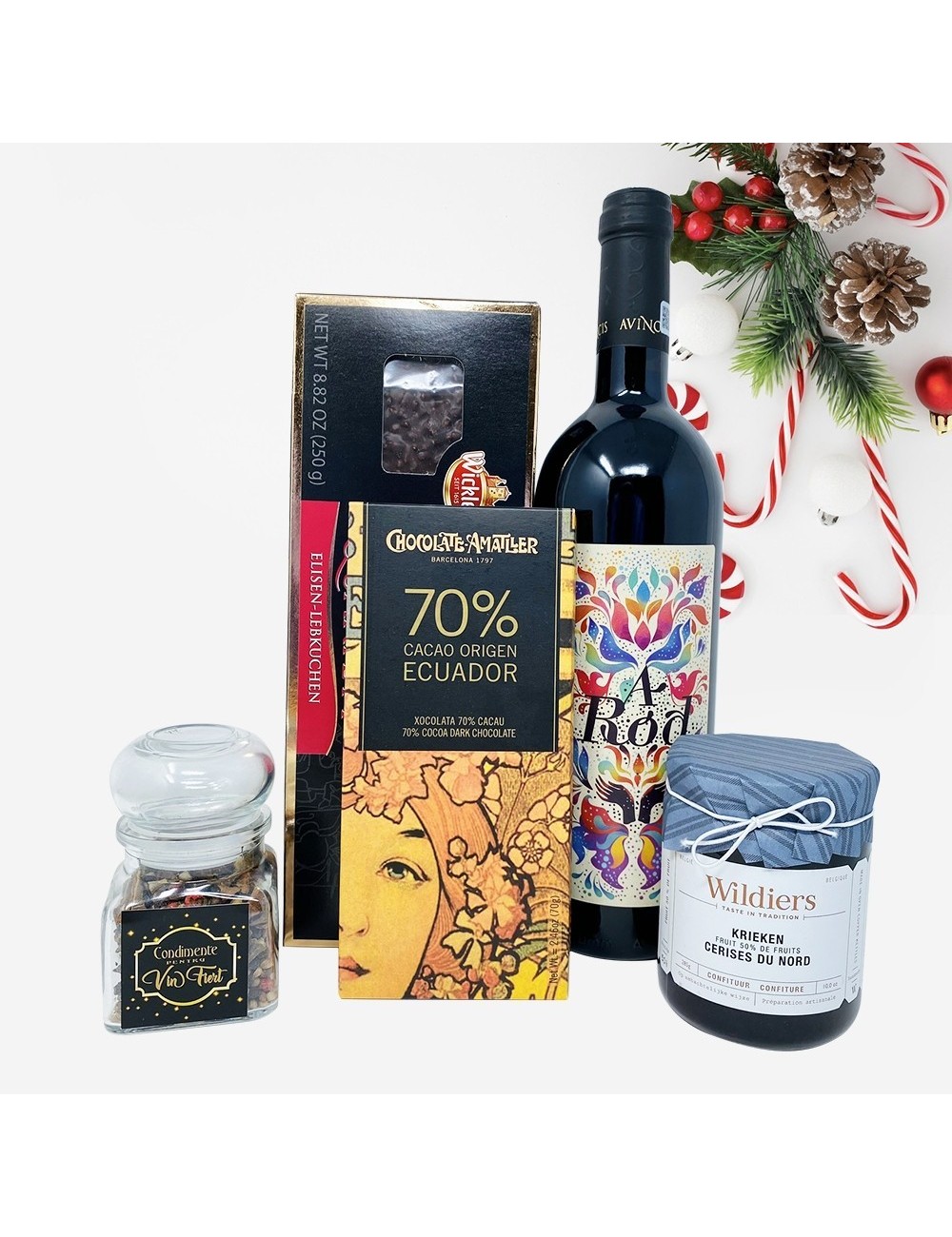 Pachetul cadou include: Vin rosu A Rod Cabernet Sauvignon 750 ml; Quartett Elisen Turta Dulce 250g; Tableta din Ciocolata Amatller Chocolate 70% Cacao Ecuador 70g; Dulceata de cirese Wildiers Valentino 285g; Condimente pentru vin fiert 30g; Cutie cadou.
