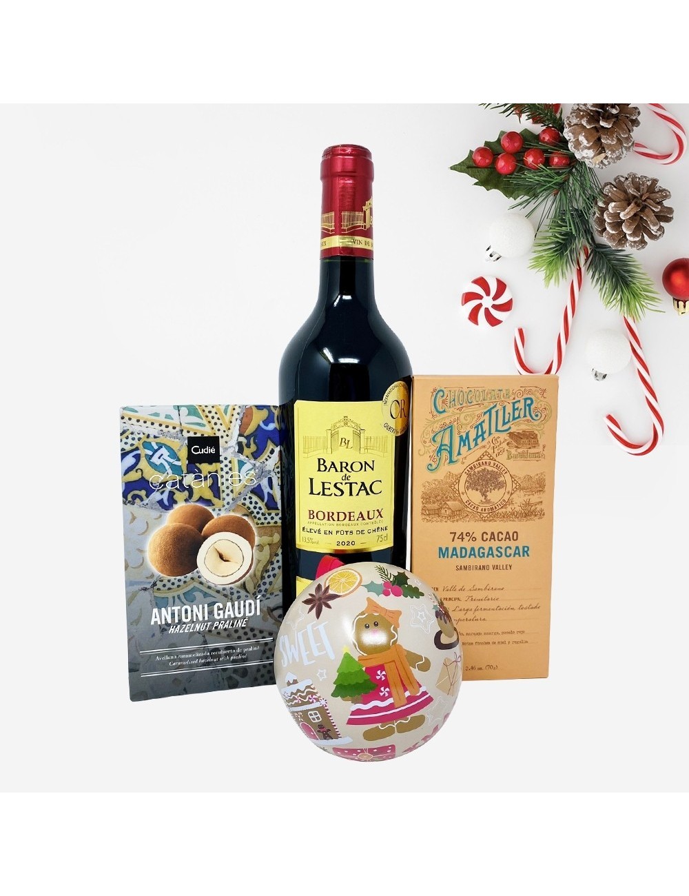 Pachetul cadou include: Vin rosu sec Baron de Lestac Bordeaux 750 ml; Alune caramelizate Catanies Gaudi Hazelnut 80g; Glob de Craciun cu praline belgiene Valentino la 100g; Tableta din ciocolata Amatller Chocolate 74% Cacao Madagascar 70g; Cutie cadou.