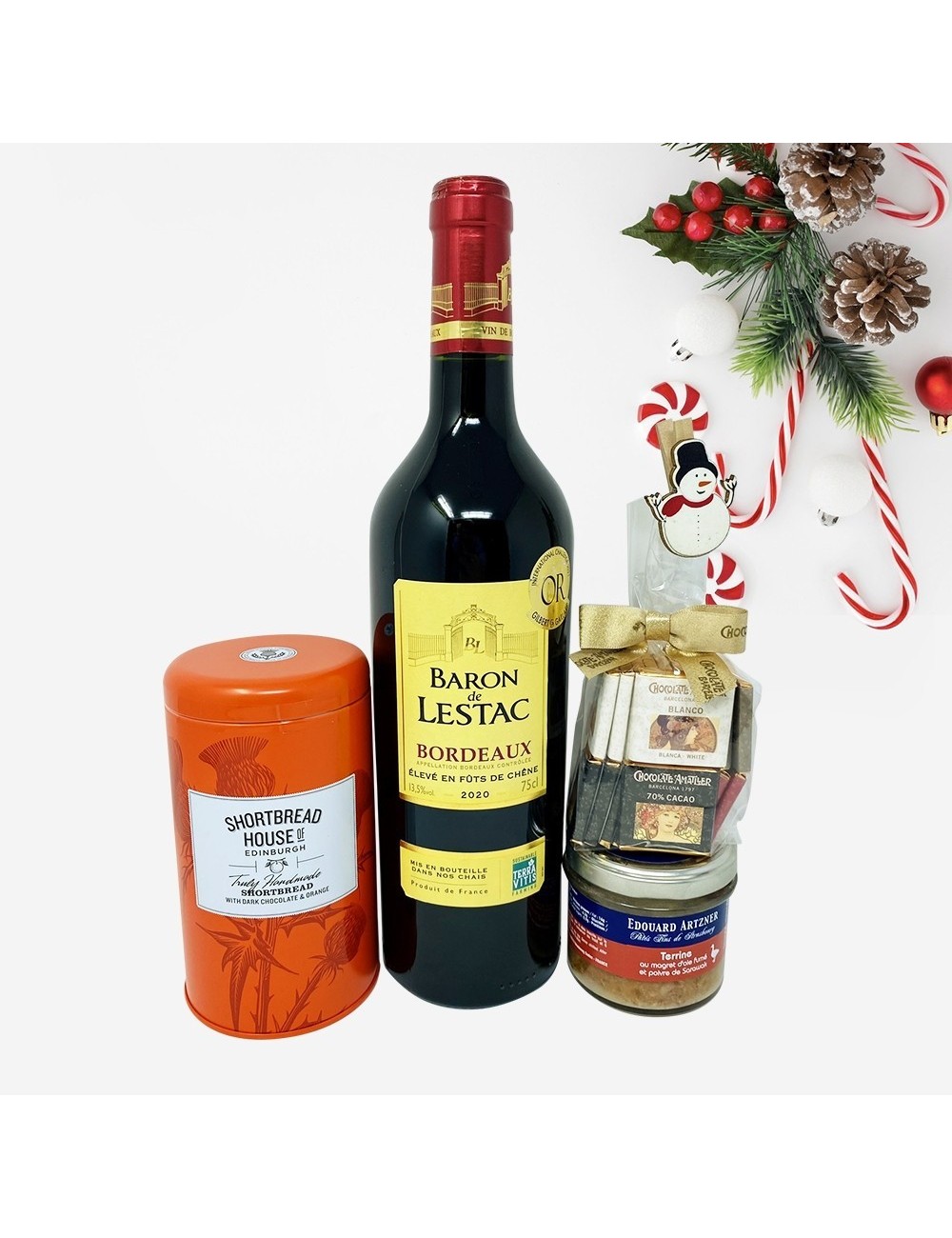 Pachetul cadou include: Vin rosu sec Baron de Lestac Bordeaux 750 ml; Biscuiti Artizanali cu unt, portocala si perle de ciocolata Shortbread 140g; Amatller Assorted Mini Chocolates 120g; Terina din piep de Gasca Afumat cu piper Sarawak 100g; Cutie cadou.