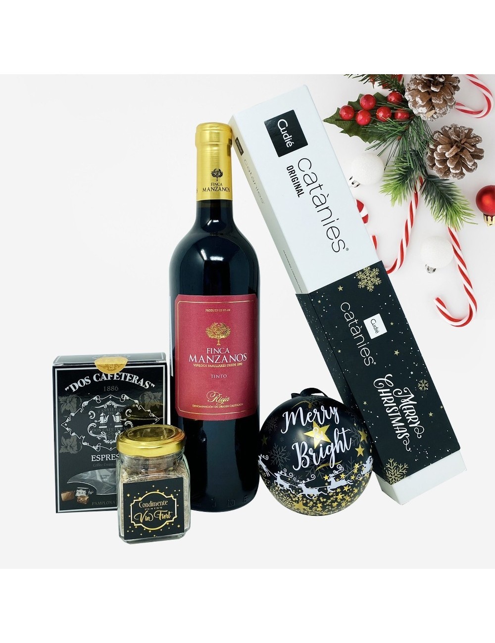 Pachetul cadoul include: Vin rosu Finca Manzanos Tinto 750 ml; Glob de Craciun cu praline belgiene Valentino la 100g; Condimente pentru vin fiert 30g; Migdale Caramelizate Catanies Christmas Original 250g; Caramele Cu Espresso Dos Cafeteras 100g; Cutie cadou.
