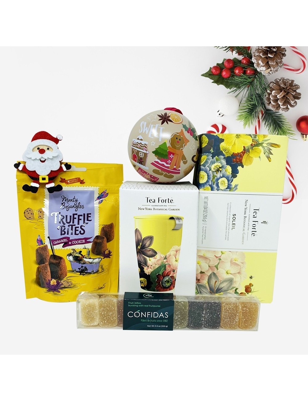 Pachetul cadou include: Monty Bojangles Truffle Bites - Cutie de Trufe cu caramel si biscuiti 100g; Cana pentru ceai din ceramica cu pereti dubli si infuzor din inox Kati Soleil; Cutie cu 10 piramide de ceai Petite Ribbon Box Soleil; Glob de Craciun cu praline belgiene Valentino la 100g; Cutie cu 10 jeleuri de fructe Confidas 100g; Cutie cadou.