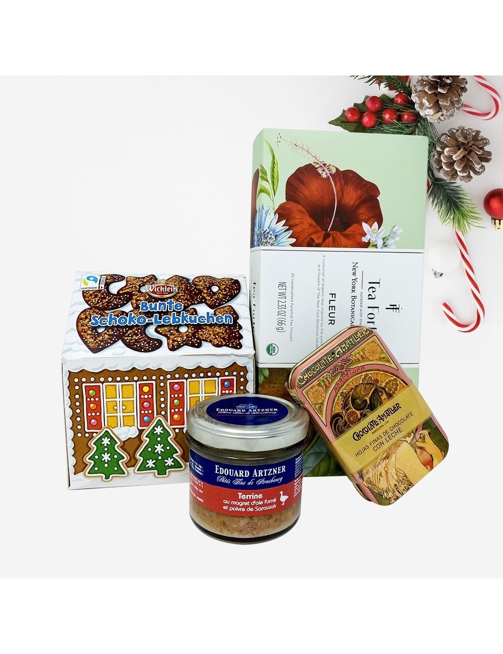 Pachetul cadou include: Cutie cu 20 de piramide de ceai Ribbon Box Fleur; Casuta cu turta dulce in ciocolata 200g; Amatller Milk Chocolate Leaves 30g; Terina din piep de Gasca Afumat cu piper Sarawak 100g; Cutie cadou.