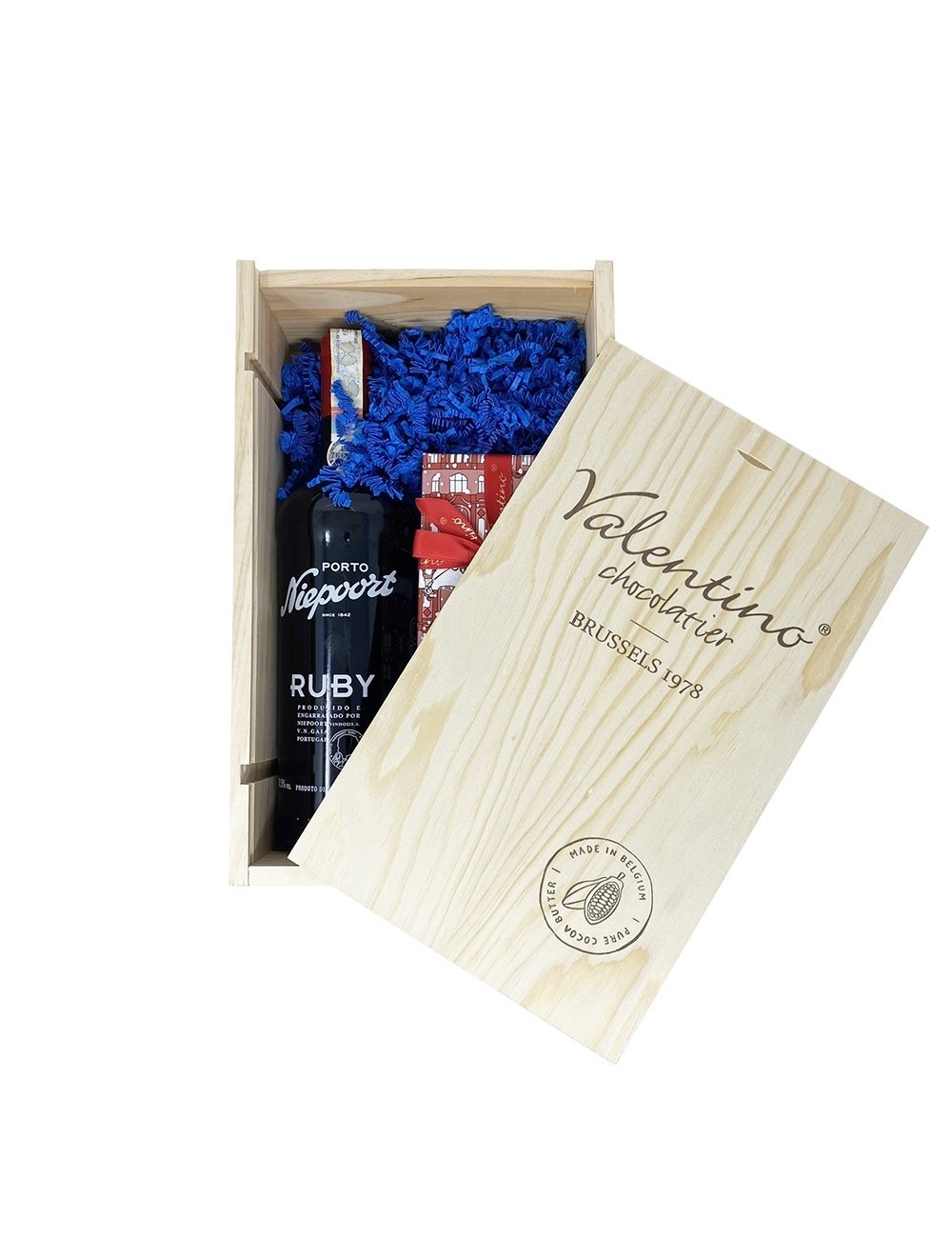Pachetul cadou include: Vin rosu Niepoort Ruby 750 ml; Ballotin Praline Belgiene Valentino San Nicolas 220g; Cutie din lemn Valentino.