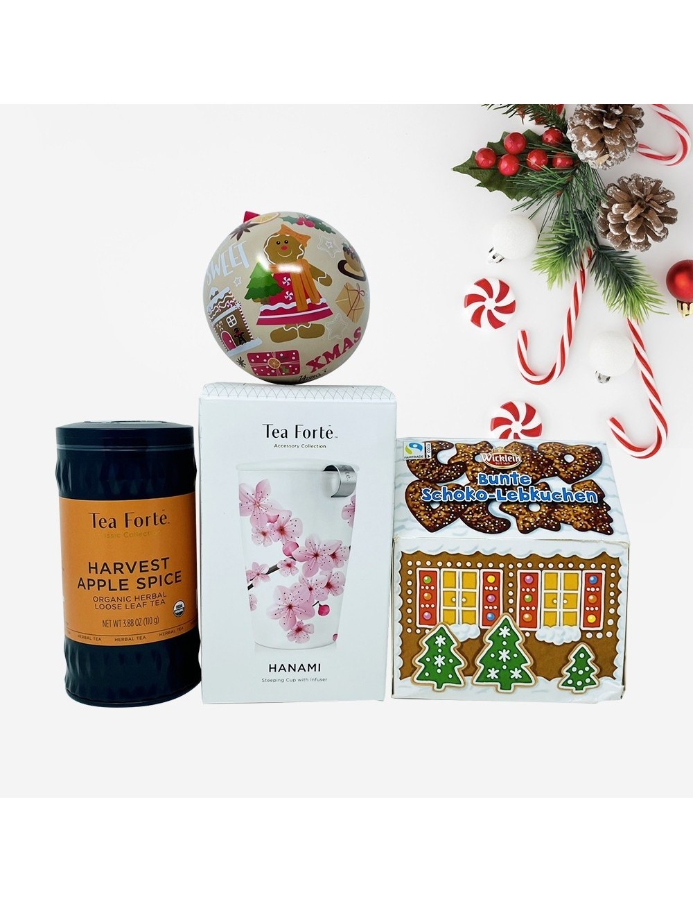 Pachetul cadou include: Cutie metalica cu infuzie de mere si condimente, Harvest Apple Spice, 50 de portii de ceai; Cana ceai din ceramica cu infuzor din inox Kati Hanami; Glob de Craciun cu praline belgiene Valentino la 100g; Casuta cu turta dulce in ciocolata 200g; Cutie cadou.