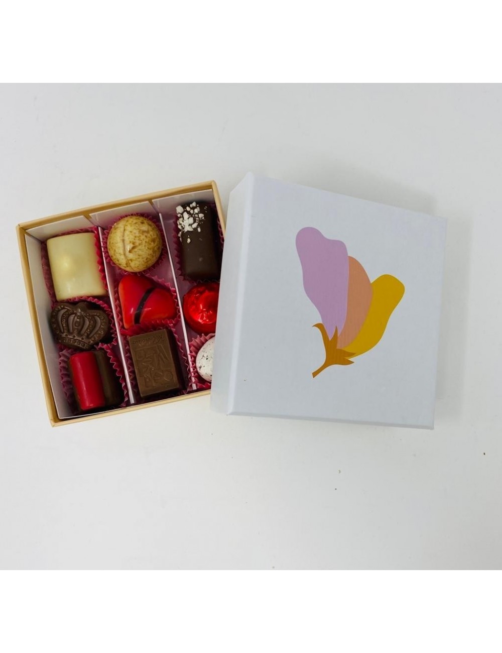 BRIGHT BLOOM BOX - CUTIE CU 110G DE CIOCOLATA BELGIANA VALENTINO contine praline delicioase cu 100% unt de cacao, intr-un amabalaj simpatic, pentru cineva special.