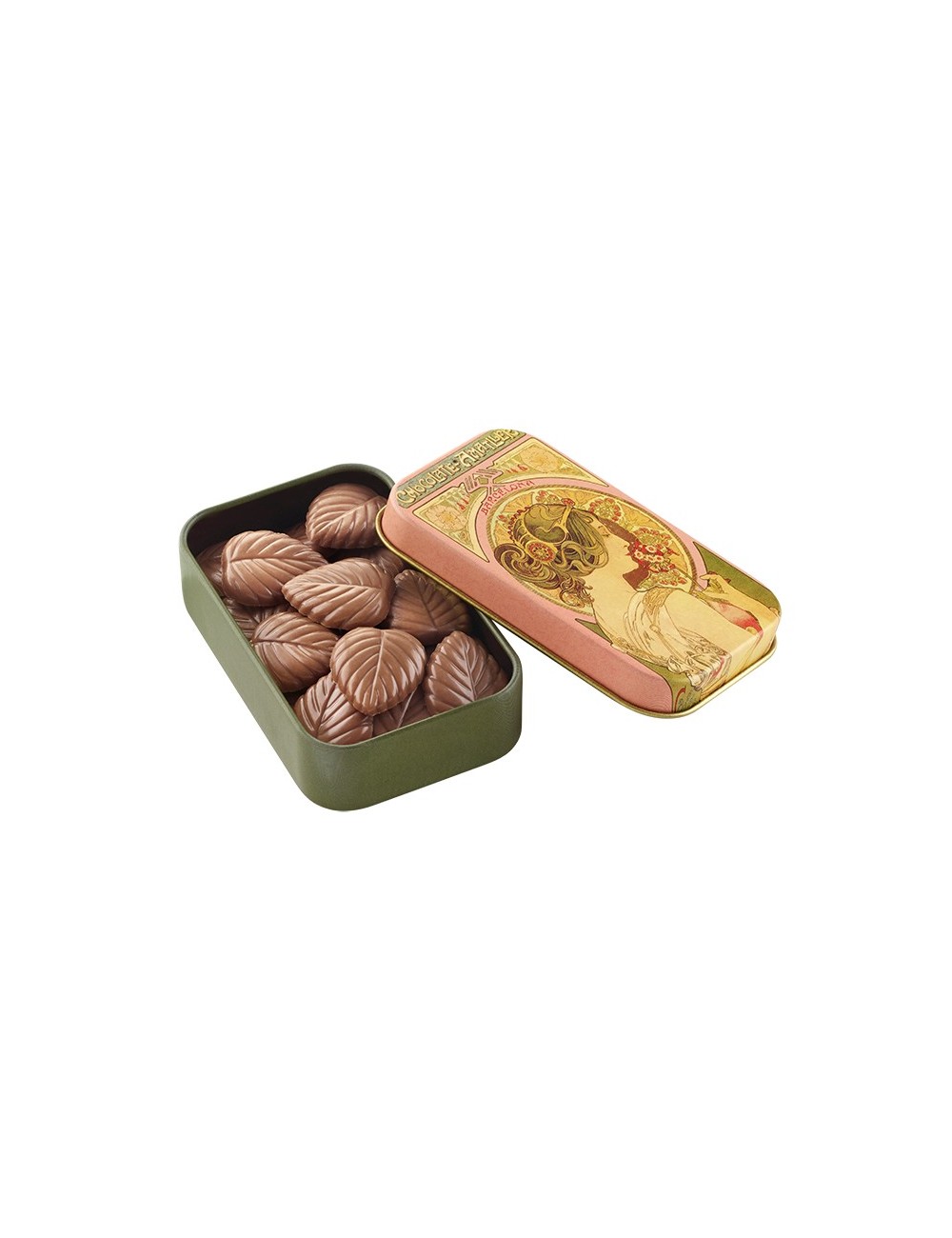 Praline in forma de frunze subtiri delicioase de ciocolata de cacao 70% in interiorul unei cutii metalice decorate cu design clasic al brand-ului Chocolate Amatller. Realizate in conformitate cu metoda traditionala de selectie, prajire, rafinare si prindere. Aceste praline fine se caracterizeaza prin aroma lor intensa, cu o nota fructata.