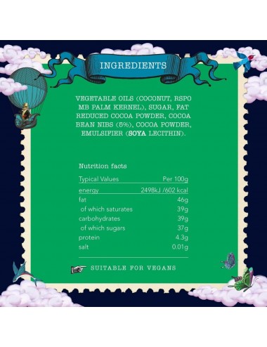 Ingrediente: uleiuri vegetale (nuca de cocos, palmier), zahar, pasta de cacao cu grasimi, boabe de cacao (5%), pudra de cacao, emulsionant (lecitina de soia).