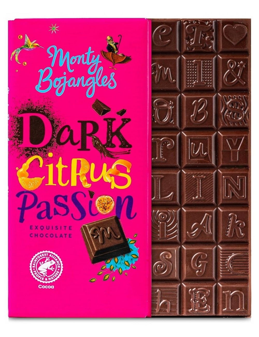 Ingrediente: zahar, masa de cacao, unt de cacao, coaja de portocale confiata (7%) (coaja de portocale, sirop de glucoza-fructoza, zahar, suc de lamaie), ulei de mandarine (0,1%), aroma naturala de fructul pasiunii (0,1%).