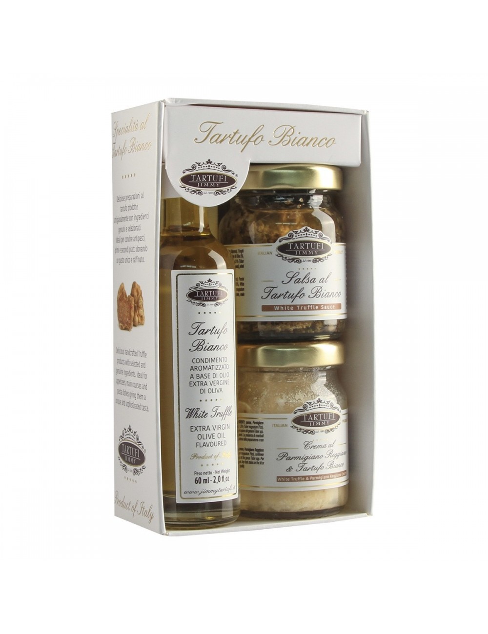 White Truffle Gourmet Jimmy TArtufi este un pachet cadou sau un gift pack si este format dintr-o cutie elegantă de cadou cu: 1 sticlă de condiment de trufă albă pe bază de ulei Evo de 60 ml 1 borcan de 50g sos de trufă albă 1 borcan Parmigiano Reggiano & Cremă de trufă albă de 50g